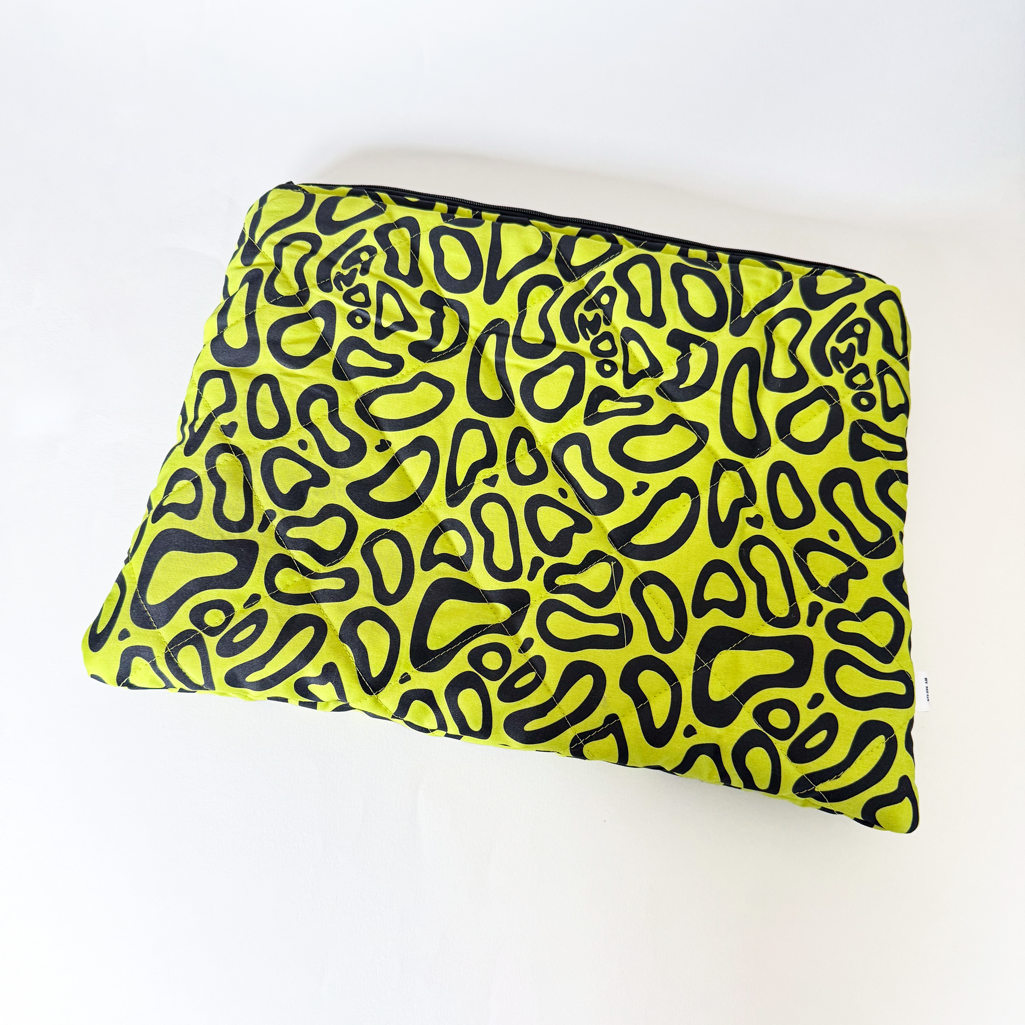 Cute laptop sleeve with neon yellow and black squiggly design, and black checkered flag on the inside, inspired by Lando Norris' helmet design.