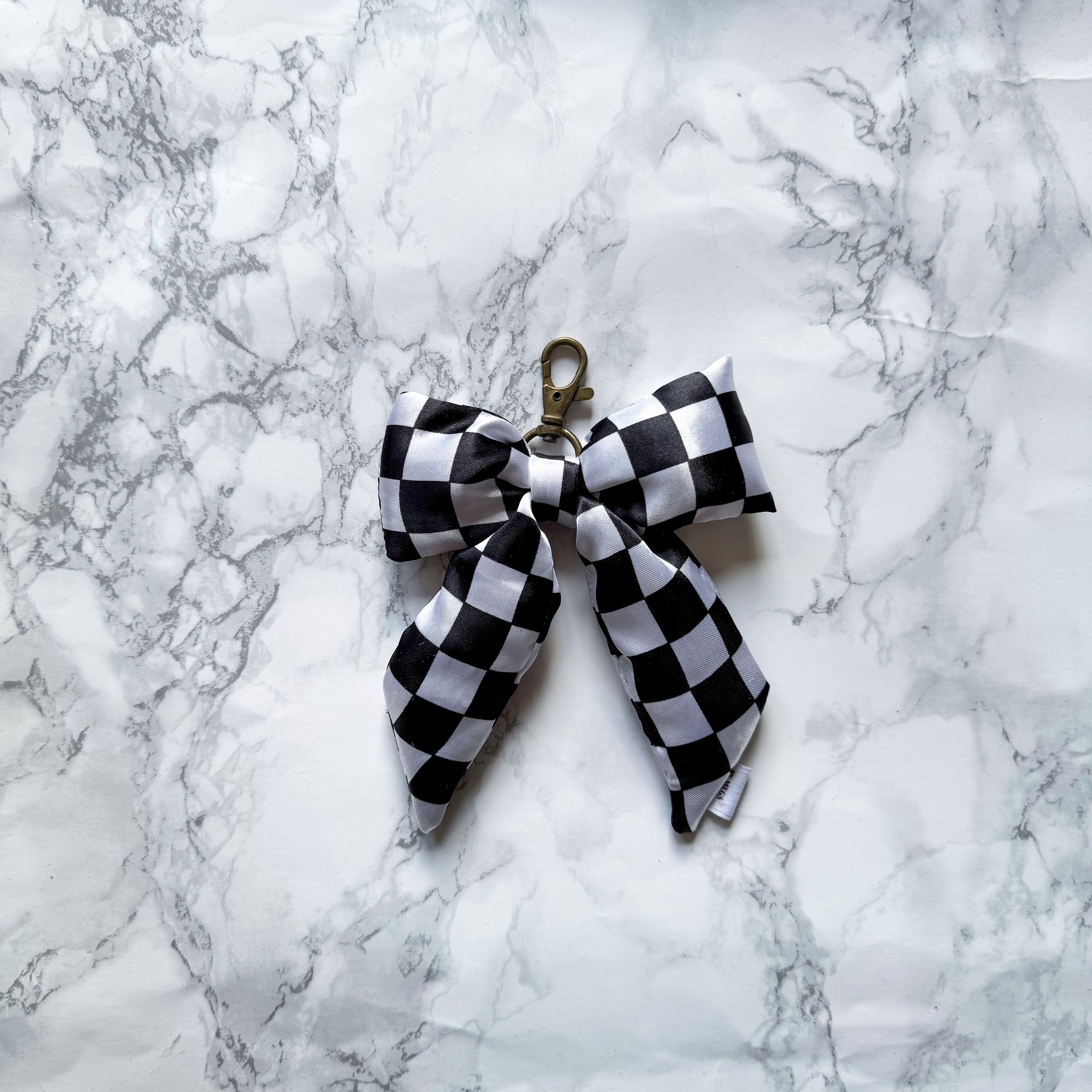 Cute fluffy, satin checkered flag bow bag charm, inspired by Formula 1 racing. Comes in 3 colours: pink, red, and black checkered.